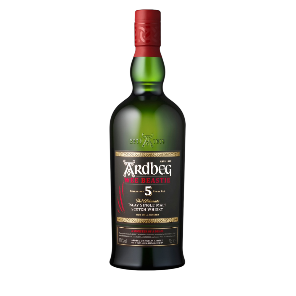 Ardbeg 5 Years Wee Beastie 70cl is een jonge maar krachtige Islay single malt die bekendstaat om zijn intense turfrook en uitgesproken karakter. Ondanks de relatief korte rijping van vijf jaar levert deze whisky een explosief smaakprofiel met rook, peper en teerachtige tonen, aangevuld met citrus, chocolade en een subtiele vanilletoets. De jeugdige energie geeft de whisky een robuuste structuur met een pittige kruidigheid en een lange, rokerige afdronk. Wee Beastie laat zien hoe krachtig en levendig jonge Ardbeg kan zijn, met een rauwe maar gebalanceerde stijl. Een uitstekende keuze voor liefhebbers van stevige, rokerige Islay whisky met veel karakter.