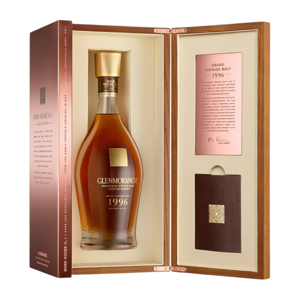 Glenmorangie Grand Vintage Malt 1996 70cl is een uitzonderlijke Highland single malt uit de prestigieuze Bond House No. 1 Collection. Deze vintage whisky rijpte lange tijd in zorgvuldig geselecteerde vaten, waaronder ex-bourbon- en wijnvaten, wat zorgt voor een bijzonder gelaagd en elegant smaakprofiel. In de geur en smaak komen tonen van rijp steenfruit, honing en citrus naar voren, aangevuld met vanille, amandel en subtiele kruidigheid. De lange rijping geeft de whisky een fluweelzachte structuur en een complexe diepte waarin fruit, hout en zachte zoetheid perfect samenkomen. De afdronk is lang en verfijnd met elegante eikentonen en een frisse fruitige nuance. Een exclusieve keuze voor liefhebbers en verzamelaars van bijzondere vintage single malts.